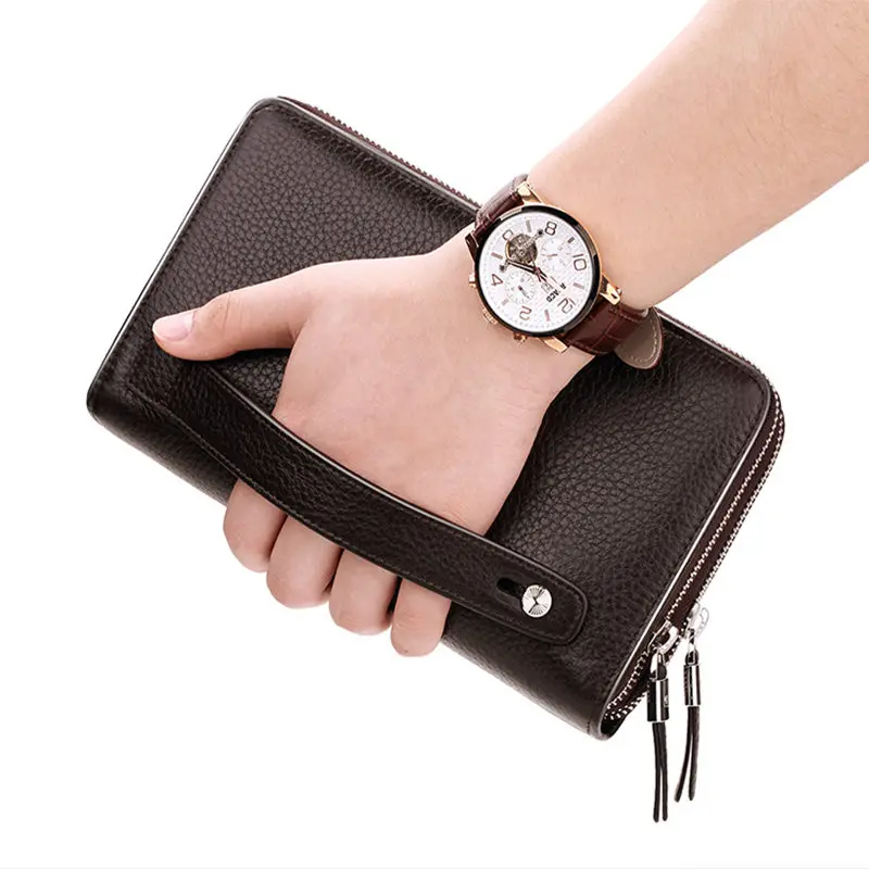 Promo WILLIAMPOLO Leather Vintage Solid Clutch Bag Phone and Card Brand Mens Wallet Double Zipper Genuine